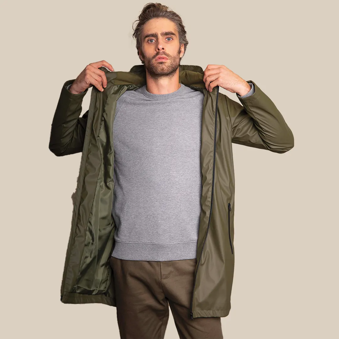100% polyester. Enduction PU sur la surface. 5 000 mm waterproof. Doublure 100% polyester 210T taffetas.